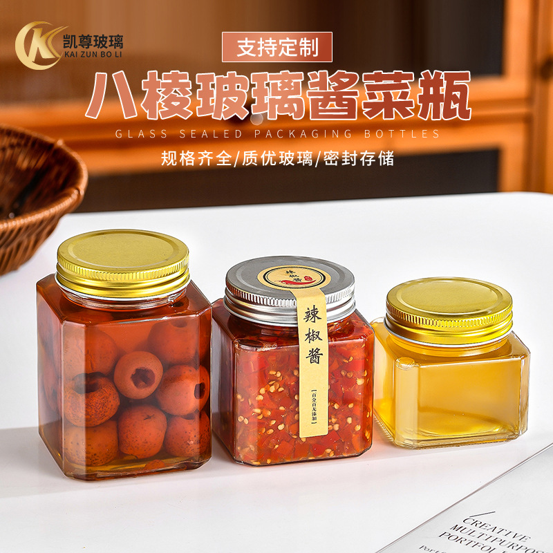 卸売り六稜ガラス蜂蜜瓶食品包装瓶透明密封唐辛子味噌汁瓶缶詰瓶貯蔵缶
