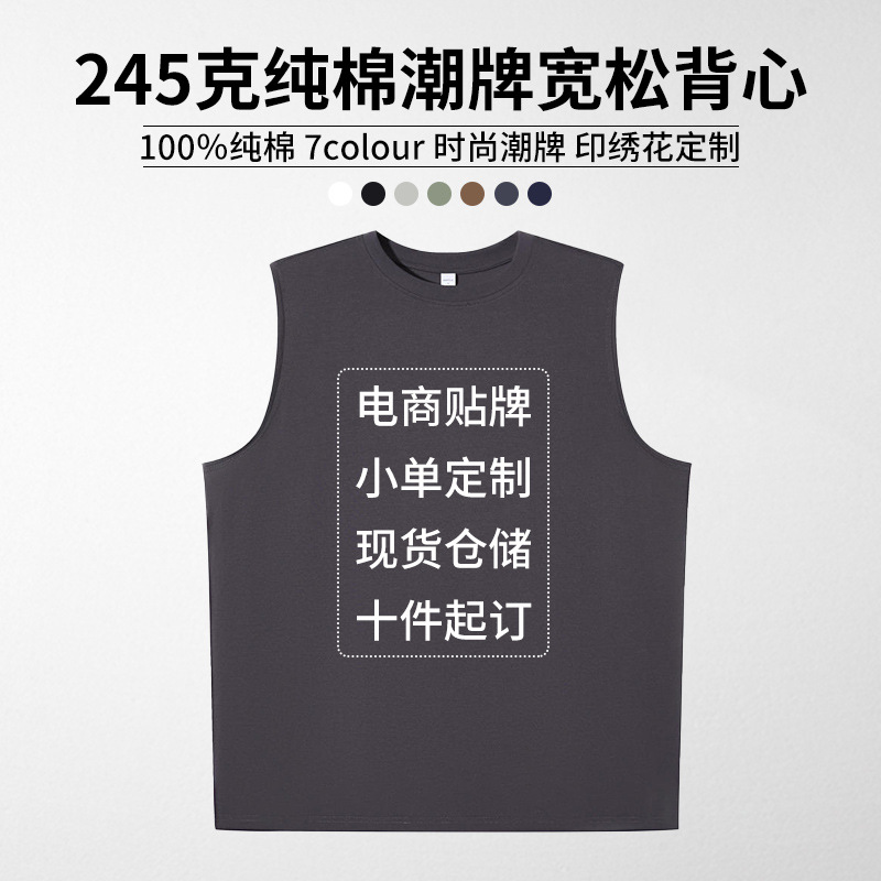 32s双紗245g純綿潮牌ゆるいベスト純色カジュアル袖なしtシャツ国潮印刷ロゴ刺繍