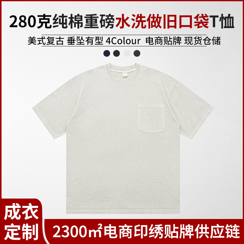 アメリカのレトロな夏の280グラムの純綿の重いポンドは洗って古いポケットの丸首の半袖のtシャツをします。
