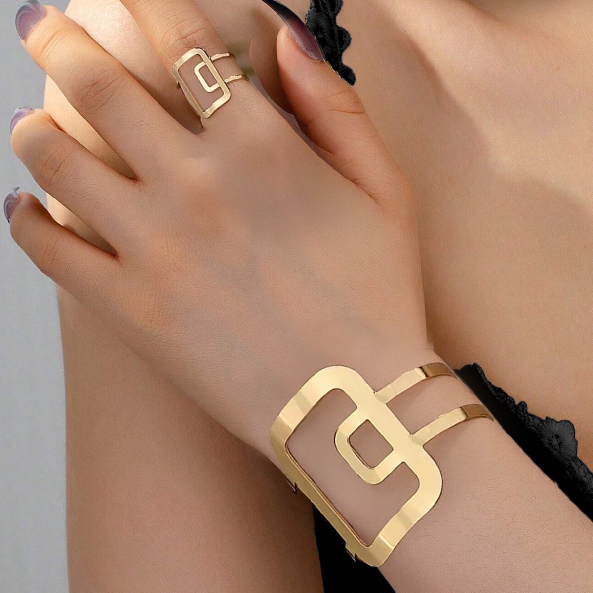 独特の幾何学模様の金色の連続リングの不規則な四角形の透かし彫りの開口部はブレスレットの指輪の個性のアクセサリーを調節することができます。