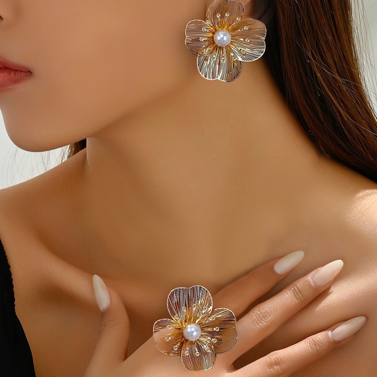 欧米の国境を越えた金色の透かし彫りは真珠の花のピアスの指輪のセットの小さい大衆のファッションの個性の装飾品の女性に似せます。