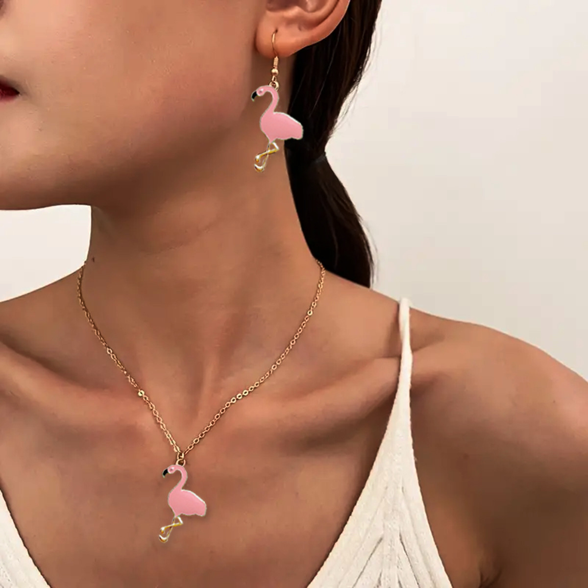 1セットの滴油合金ピンクのフラミンゴジュエリーの美しいペンダントネックレスとイヤリングins甘い風ファッションアクセサリー