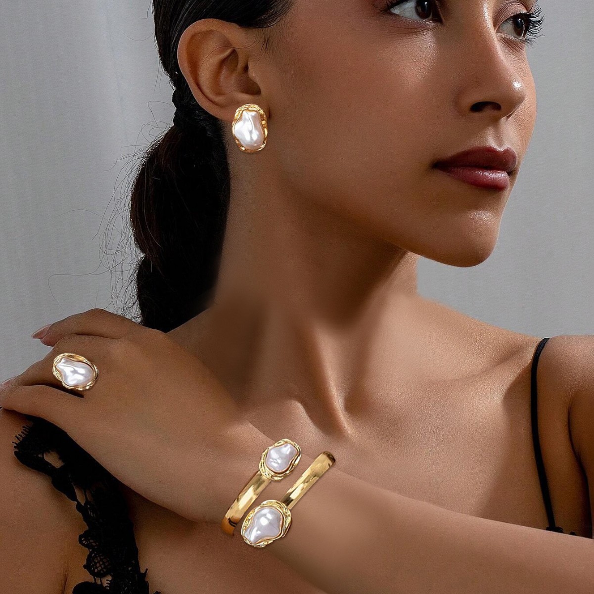 欧米の国境を越えたファッションのしわの金属の指輪の優雅な真珠の耳飾りの開口部はブレスレットのスーツを調節することができます。
