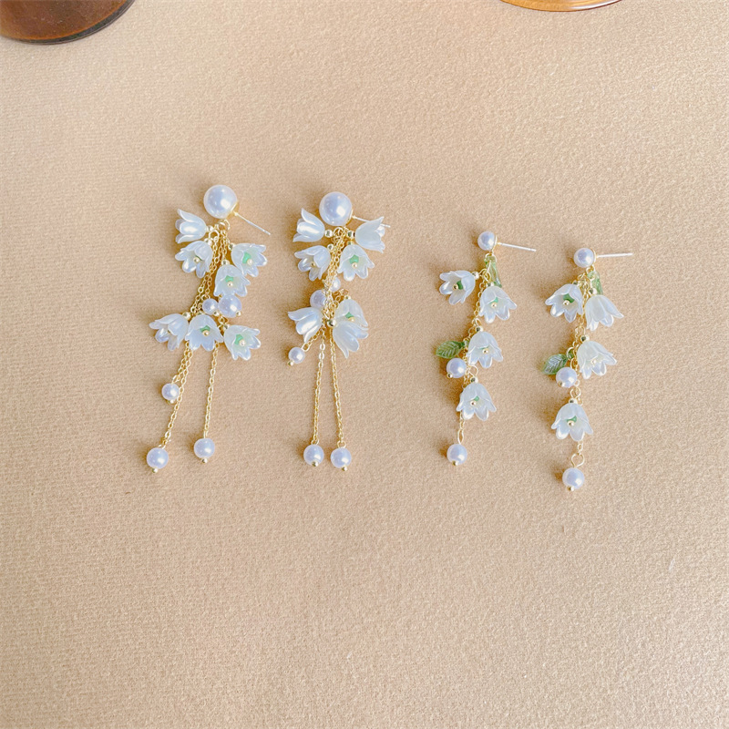 仙気の花のイヤリングの女性の白いチューリップの銀の針の真珠のピアスのすずらんの流蘇のイヤリングの気質の長いタイプの耳のクリップ