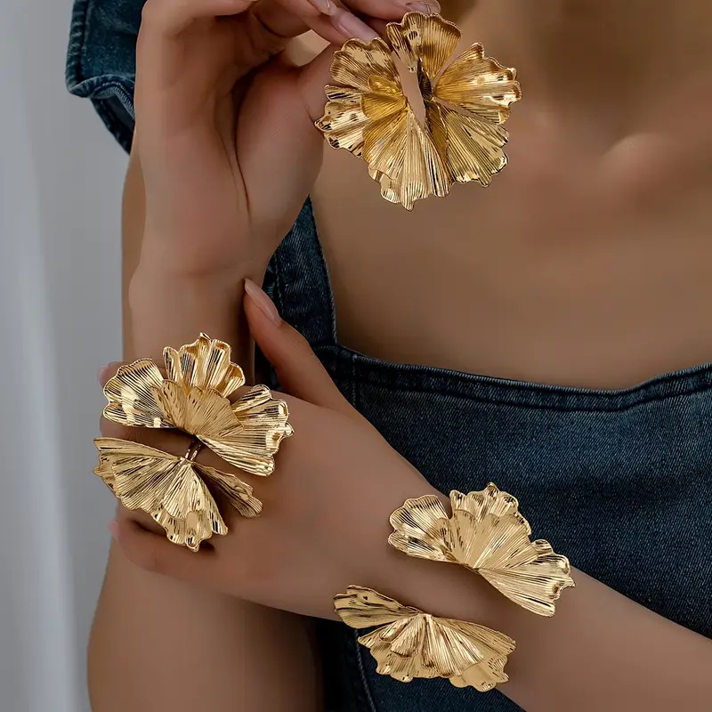 欧米の国境を越えたファッションボヘミアン風の大げさな木の葉の指輪のしわのイヤリングはブレスレットのセットを調節することができます。