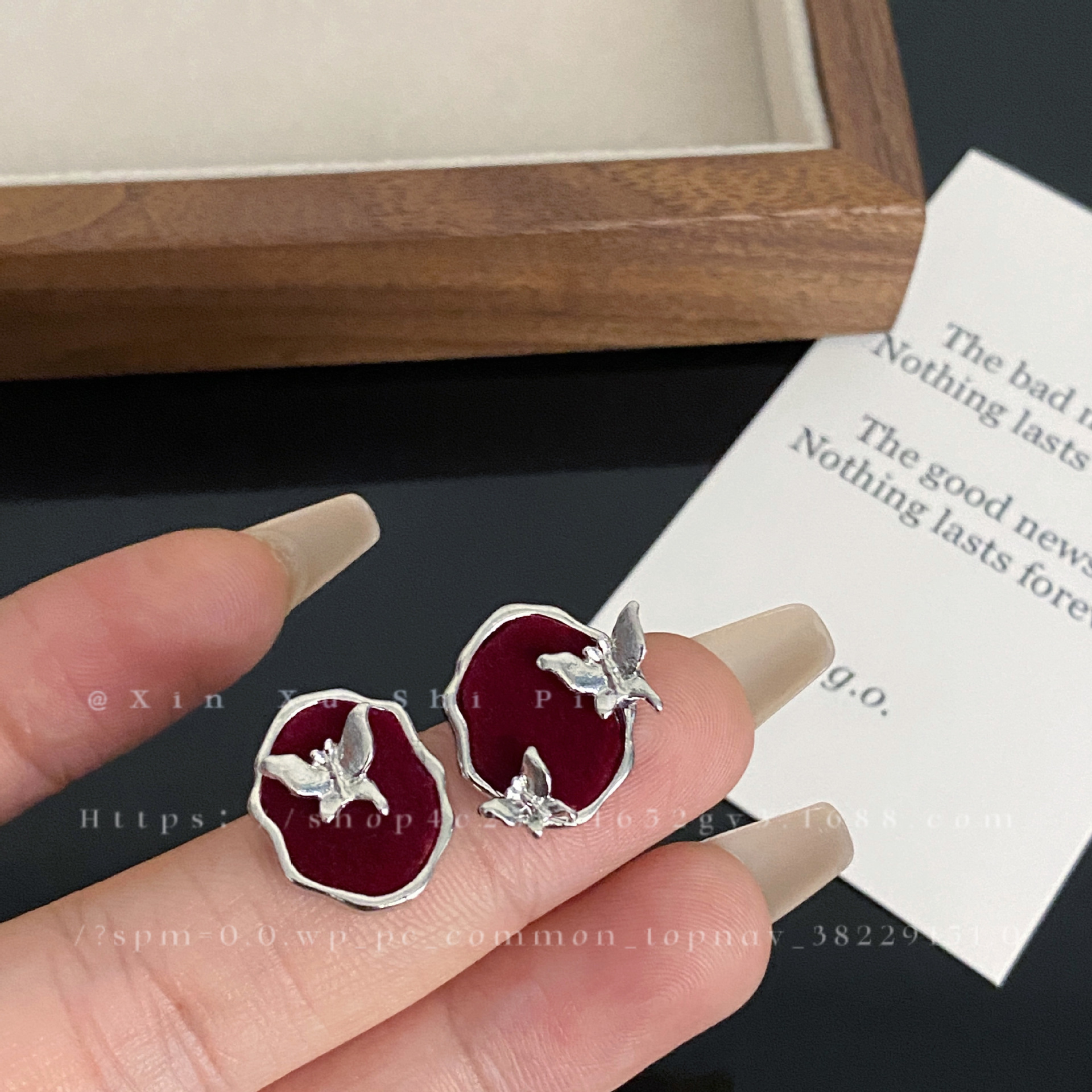 バラと山海ロマンチックフランスレトロ赤ベルベット蝶非対称イヤリング仙気質小衆ピアス