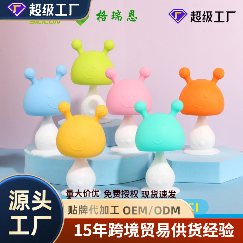 ウサギの鈴の歯のゴムの食品級のシリカゲルの歯磨き器の赤ちゃんはゴムのシリカゲルの一体成型をかむのがきのこの頭をかむのです。
