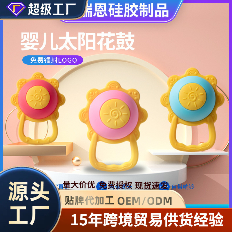 新商品の手持ち式の歯のゴムの赤ちゃんの歯の棒の音のおもちゃのシリカゲルの鈴の歯のゴムのシリコンの太陽の太鼓は噛んで楽になります。
