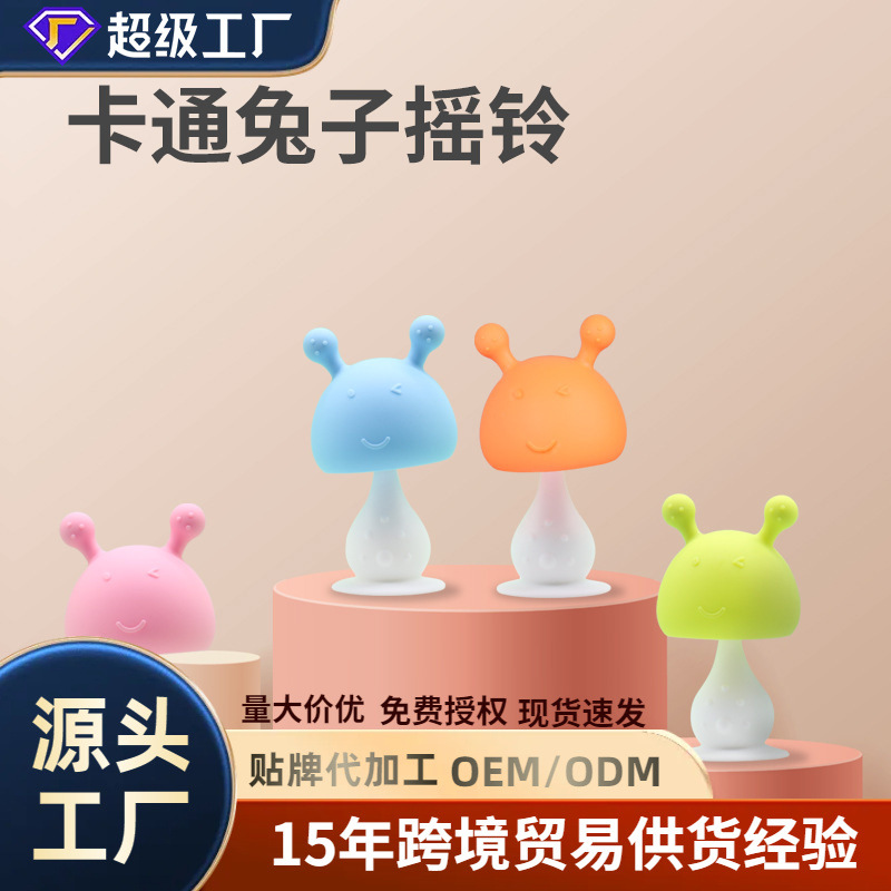 ウサギの鈴の歯のゴムの食品級のシリカゲルの歯磨き器の赤ちゃんはゴムのシリカゲルの一体成型をかむのがきのこの頭をかむのです。