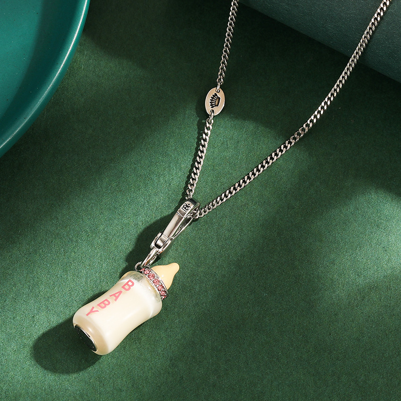 小さなかわいいエナメル釉薬文字プリントには、洗練されたアクリル哺乳瓶ペンダントがデザイン感のあるネックレスを包んでいる