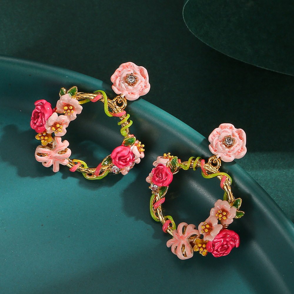 オリジナルデザインの新しい甘くてファッショナブルなエナメル釉薬ピンクローズフラワーリボンイヤリング女性用ガーランドイヤリング