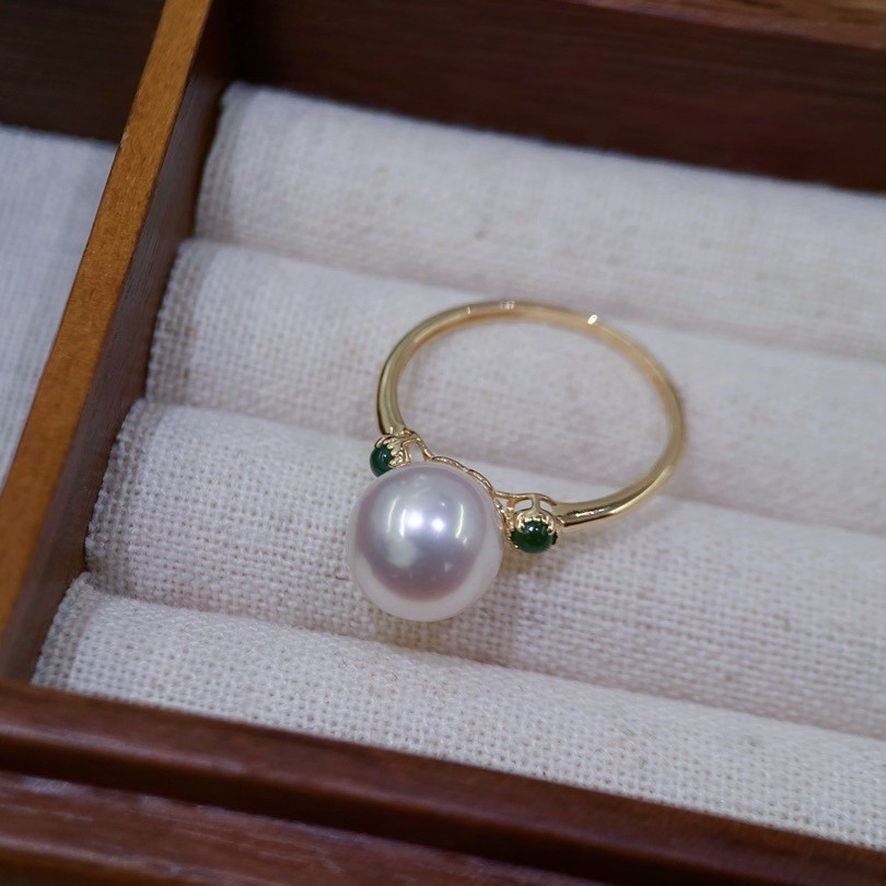 18k金の部品の小さい卵の面の濃い陽の緑の翡翠の指輪は真珠の9-10mmの部品を参考にして玉を配合します。
