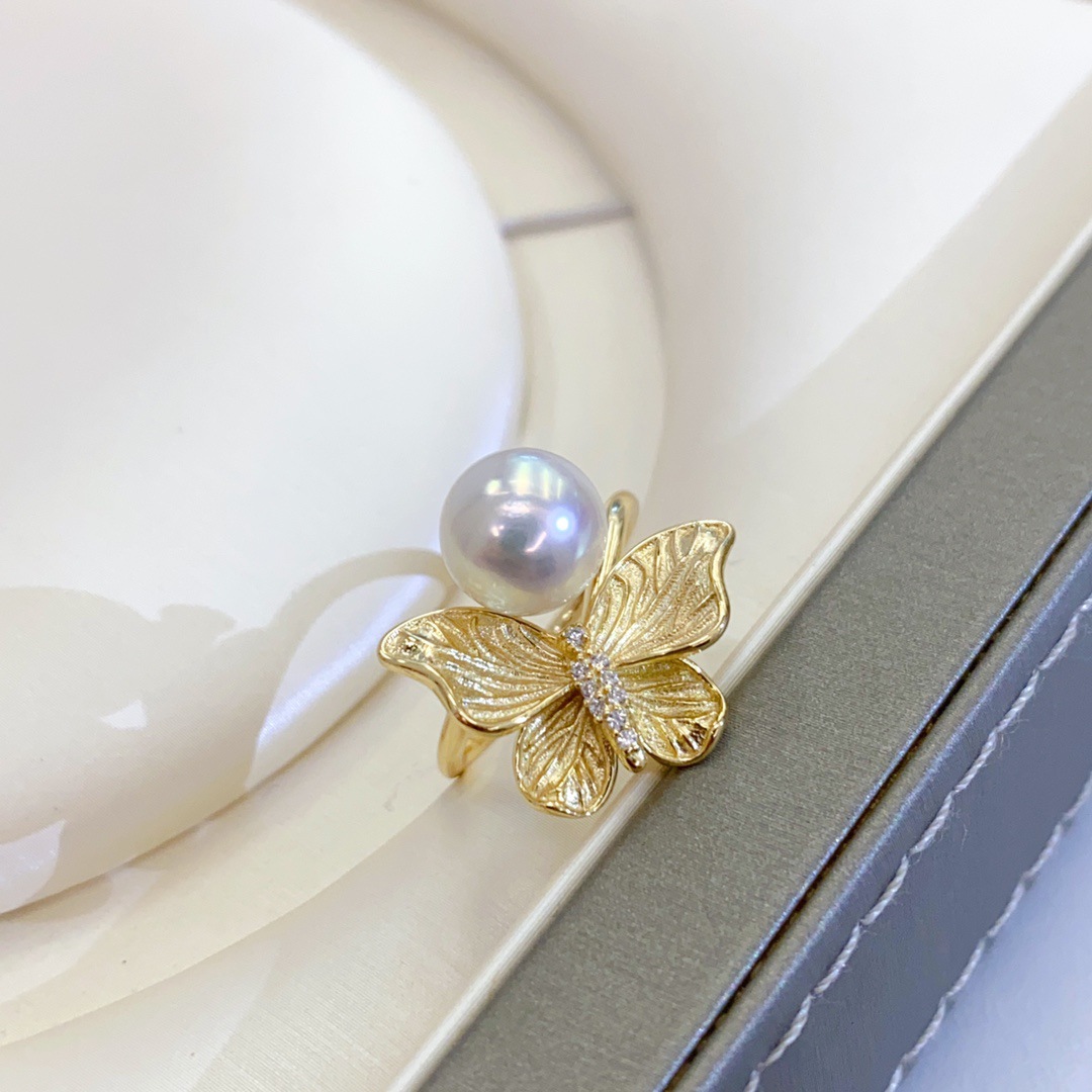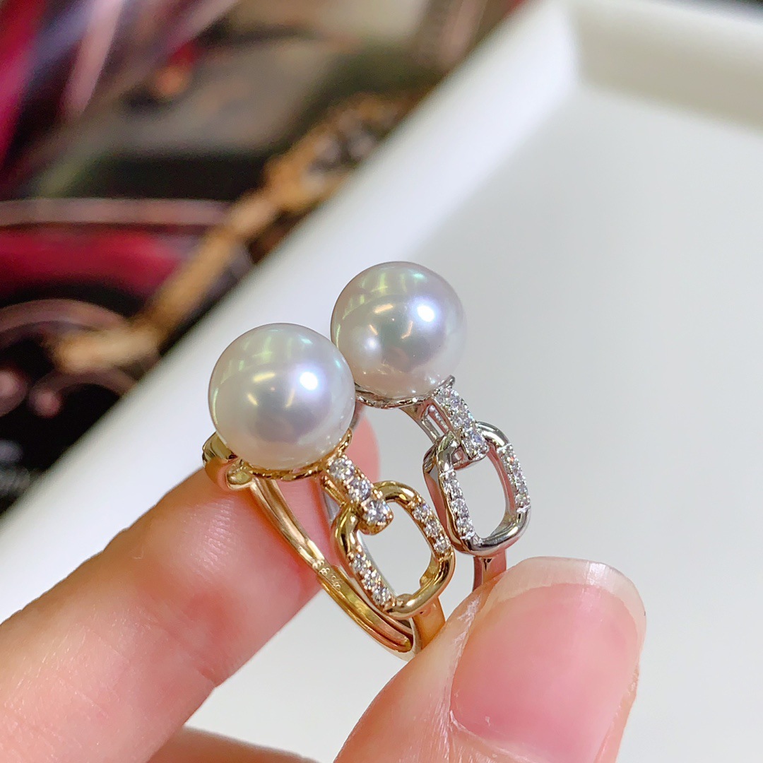 S925銀部品デザインの真珠指輪はビーズ9-10mm黄白の2色を参考にしています。