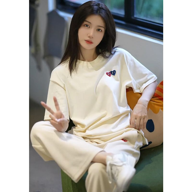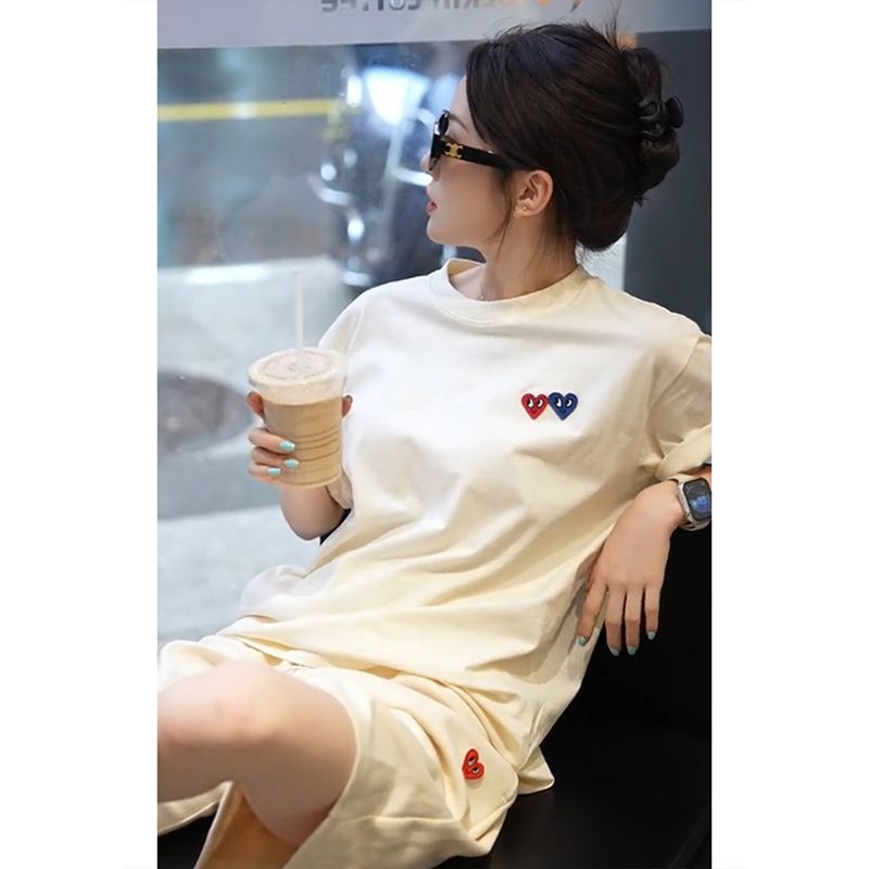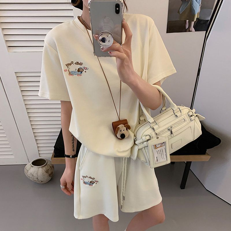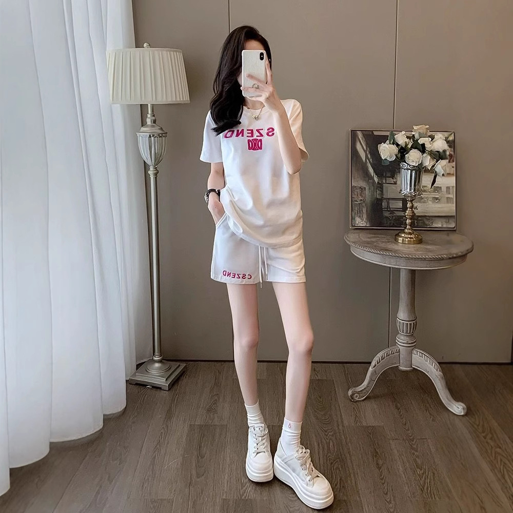 ヨーロッパ商品クロスボーダーカジュアルスポーツウェアショートパンツセット女性夏の怠惰な風ゆるい愛の刺繍半袖2点セット