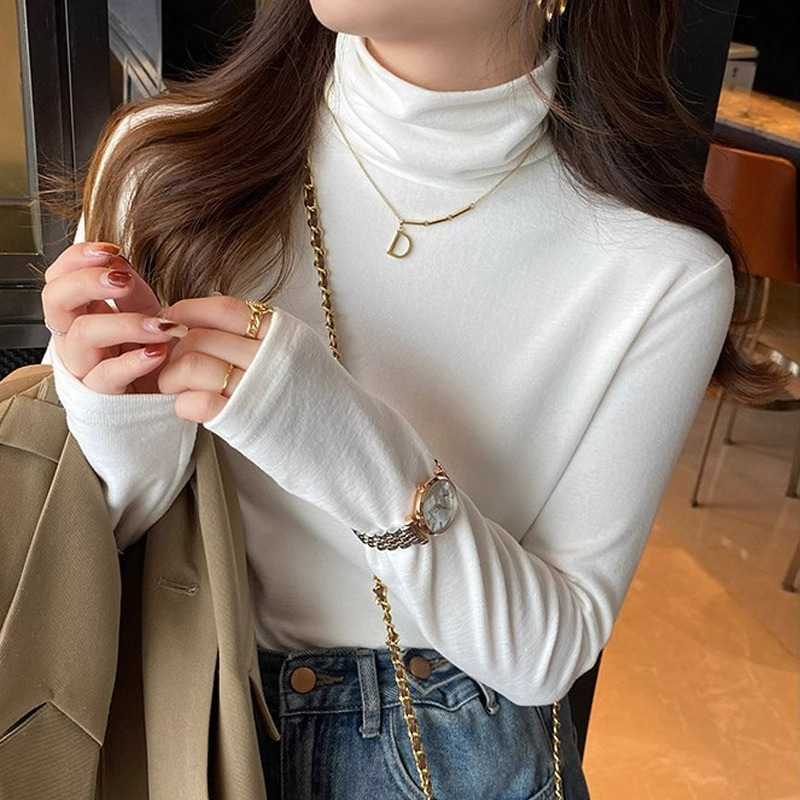 高級感のある韓国版の高襟の底のシャツの女性の秋冬の中で長袖のtシャツを掛けて身を修めます。