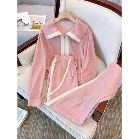 カジュアルなスポーツファッションの女性2023年春秋新作ピンクの子供の襟のガードルのワイドパンツの2つのセット