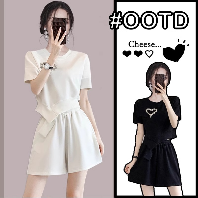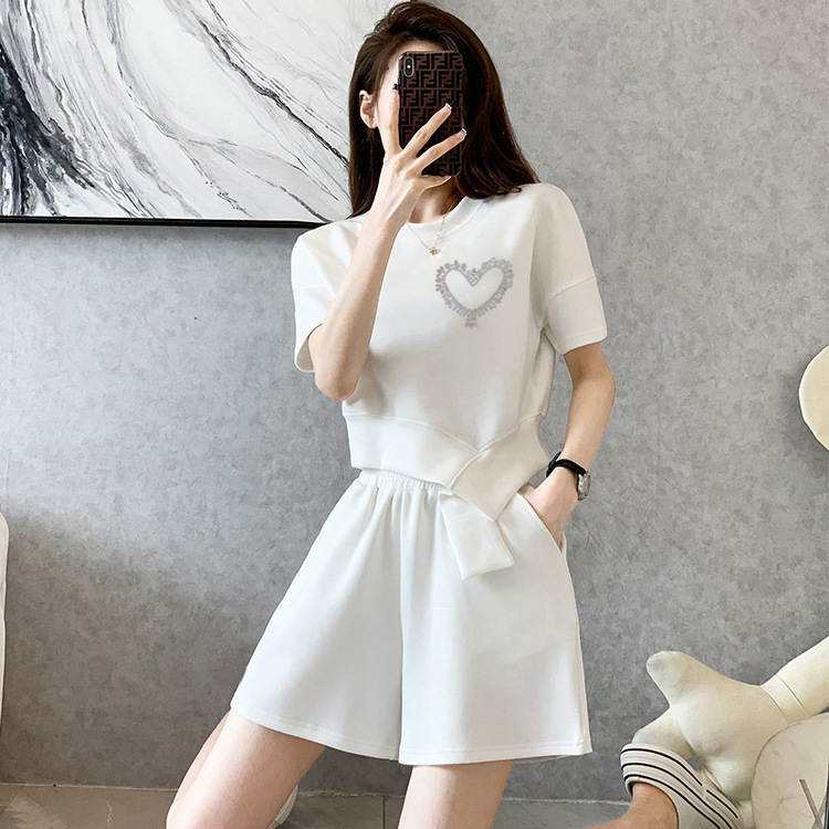 夏のファッションのスーツの女性の新型の小さい子供の韓国版のゆったりしている丸首の愛のアイロンのドリルのカジュアルな大きいサイズの2つのセットの潮