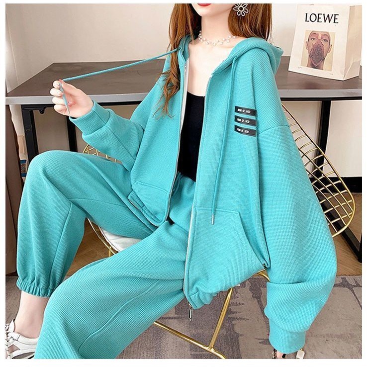 ヨーロッパ駅の韓国版ワッフルカーディガンと帽子付きスウェットスーツの女性秋の新型カジュアルコートのズボンの2つのセット