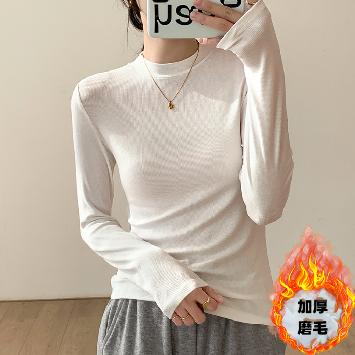 新商品の韓国版の毛磨きの肩の底のシャツの女性の杏色の長袖のtシャツの中で秋冬とベルベットの修身がやせている上着を見せます。