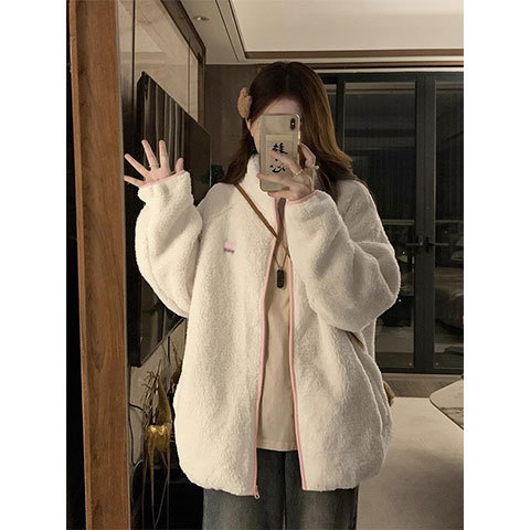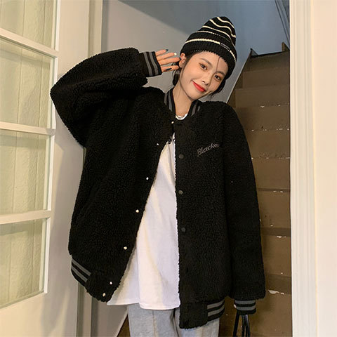 デザイン感のある羊の毛のコートの女性の冬のベルベットの厚い野球服の韓国版のゆるいフリースのカジュアルな上着