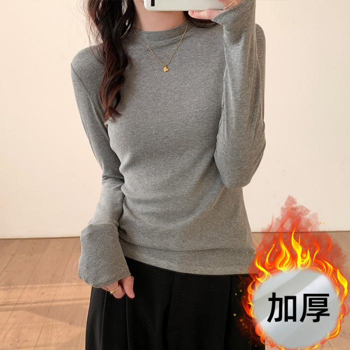 丸首に長袖のtシャツをつけて、女性の秋冬の新型の両面の絨毛は色の修身の底のシャツの中で保温の上着を掛けます。