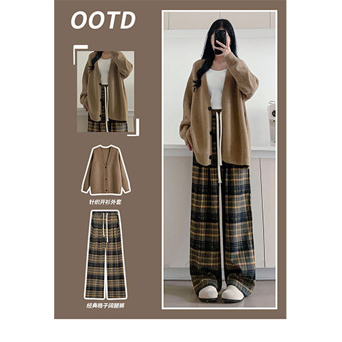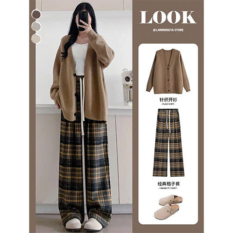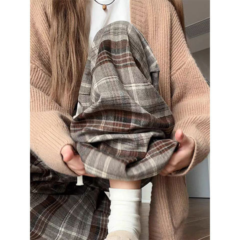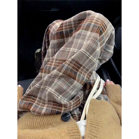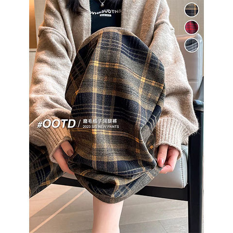 ズボンの女性のカレーの格子の秋冬の2023の新型のハイウエストのゆったりしているカジュアルはやせている感じがします。
