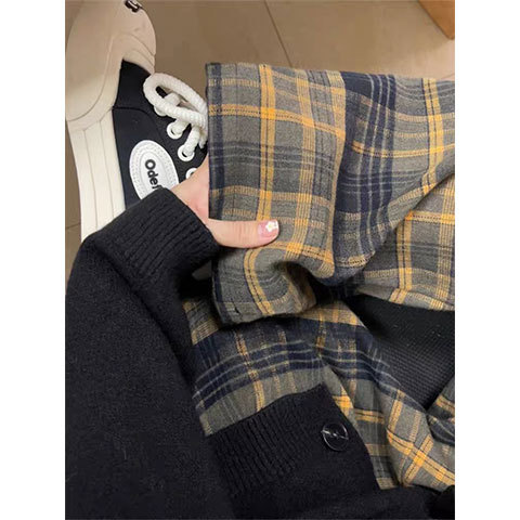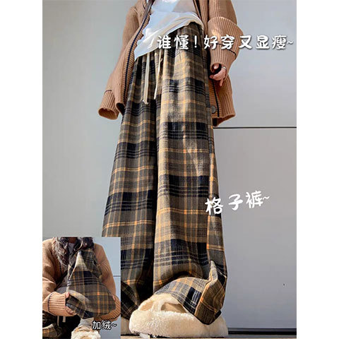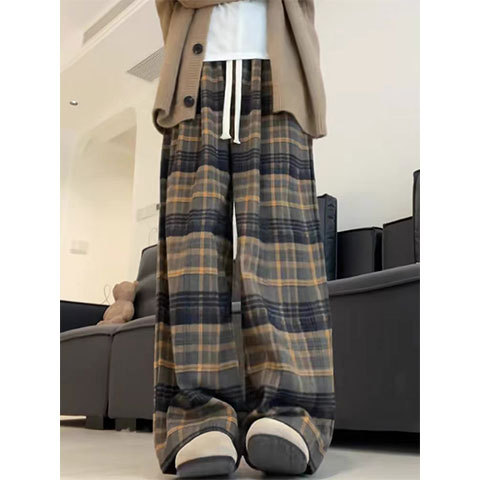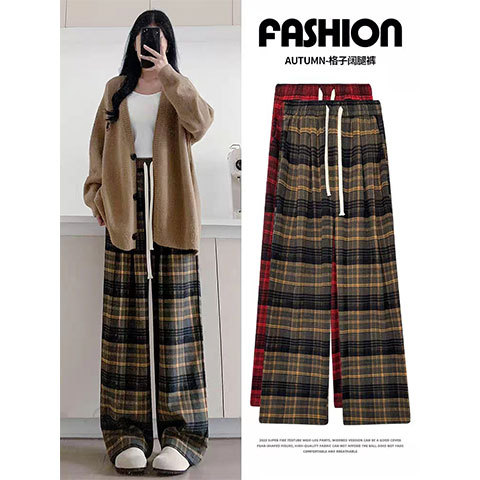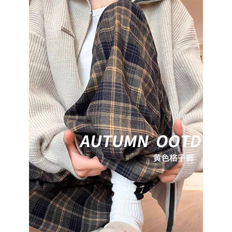 アメリカのレトロな黄色の格子の広い足のズボンの女性の秋冬の新型の学生の韓国版はゆったりしていて痩せています。