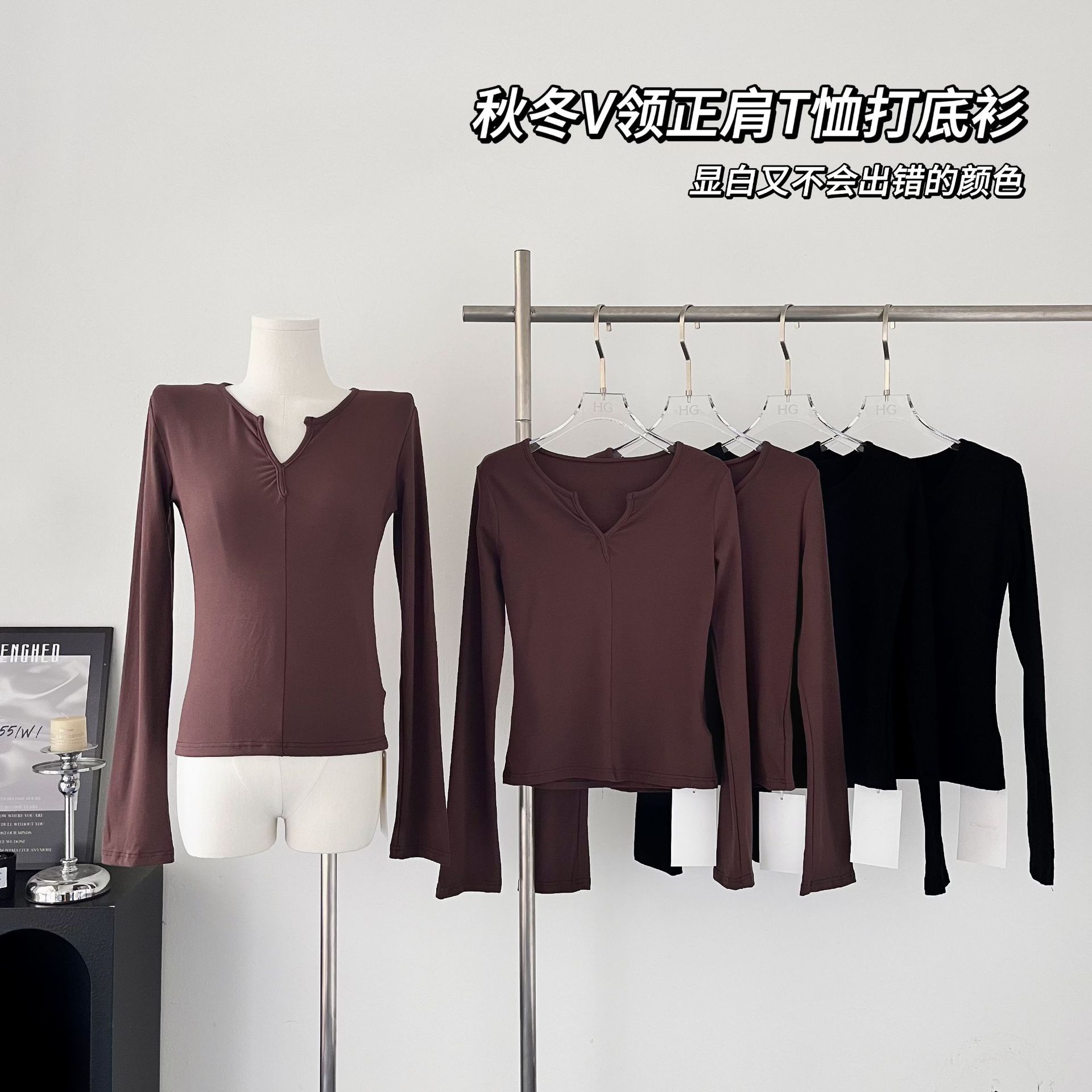 Vネックのカレー色の正肩の長袖のtシャツの女性の秋冬の新型のアメリカの復古のデザイン感が見えます。
