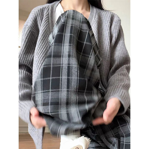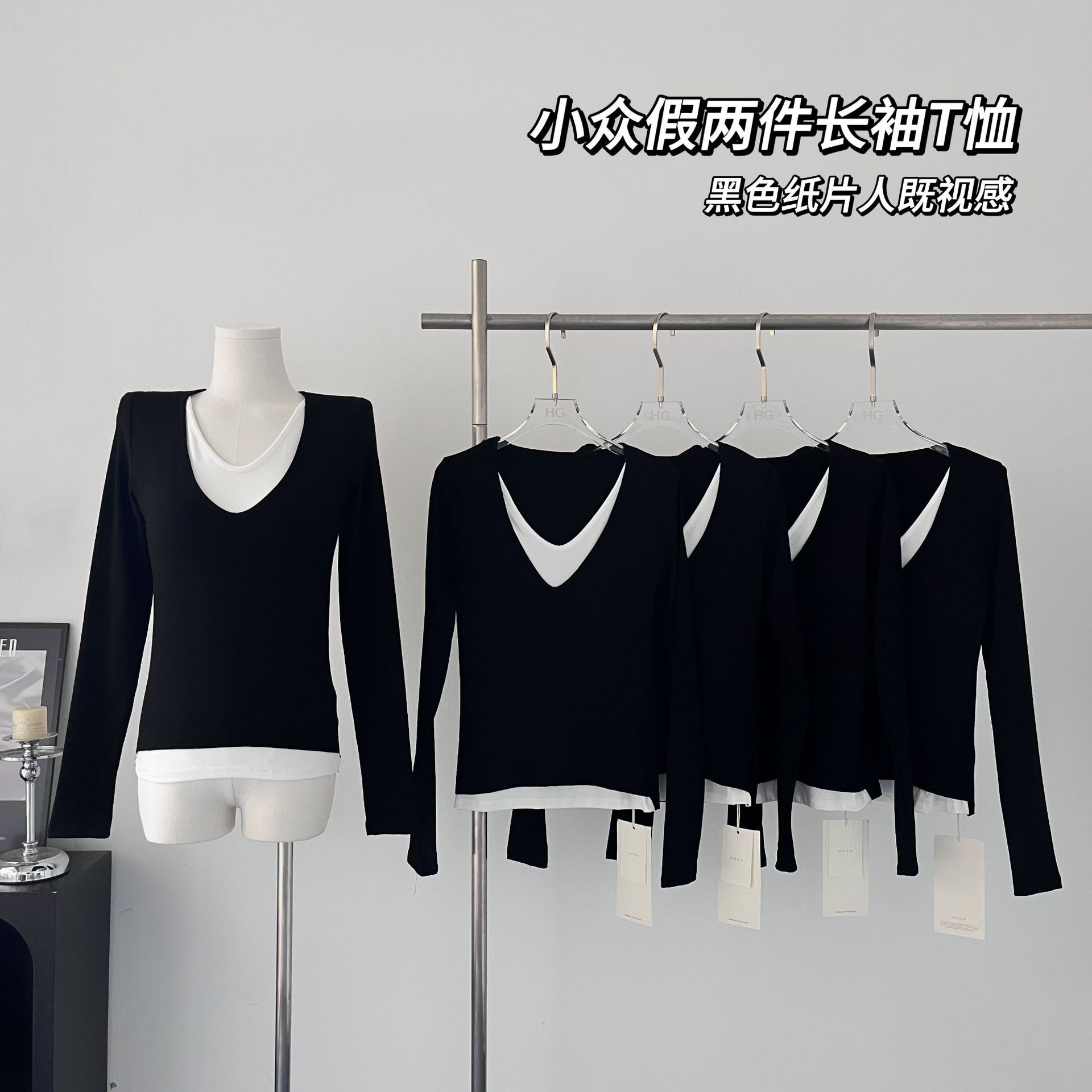 長袖tシャツの女性のデザイン感の偽の2つのステッチのニットの2023冬の韓系の修身の中でカジュアルな上着を掛けます。