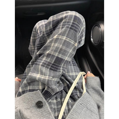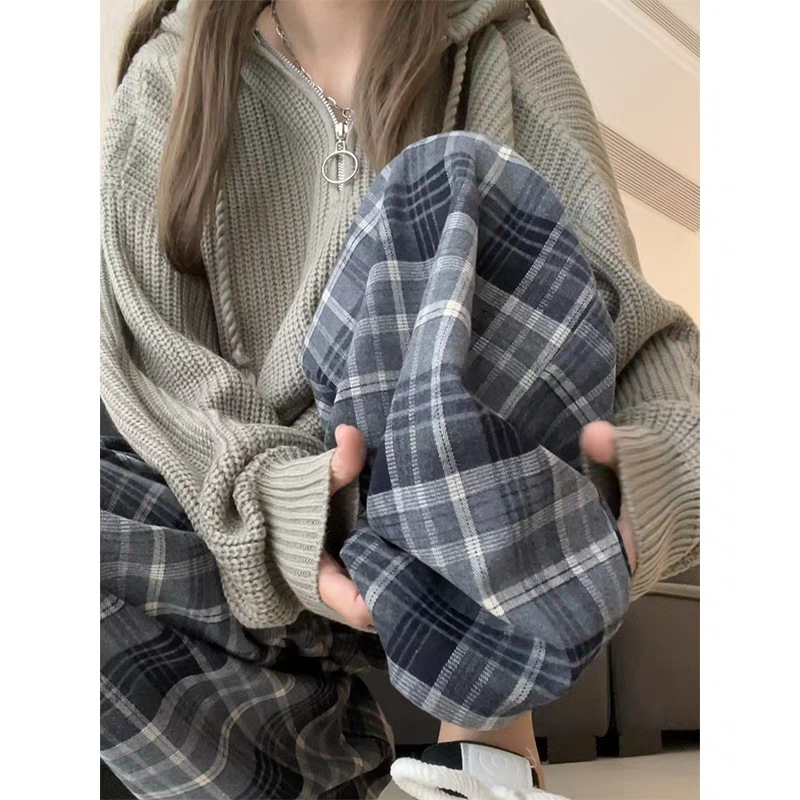 アメリカのレトロな灰色の格子の広い足のズボンの女性の秋冬の新型の学生の韓国版はゆったりしていて痩せています。