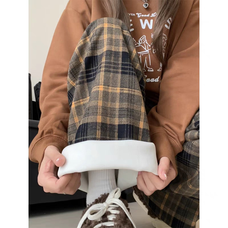 黄色の毛の格子縞のズボンの子供の垂れ下がった感じの秋冬のカジュアルな韓国版の直筒のベルベットの厚い広腿のズボンのbfの怠惰な風