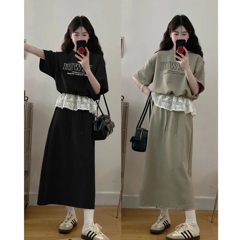 ヨーロッパの太ったMMプラスサイズの女性の夏のスーツとスプライスレース半袖ハイエンドスカートツーピーストレンディセット