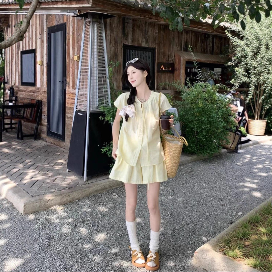 小柄な女性のための甘くてファッショナブルなスーツ夏ミルクイエロールーズレースアップ半袖シャツトップワイドレッグショーツトレンディ