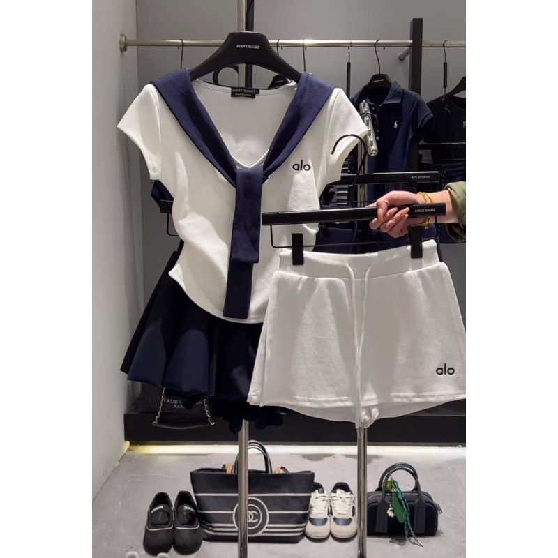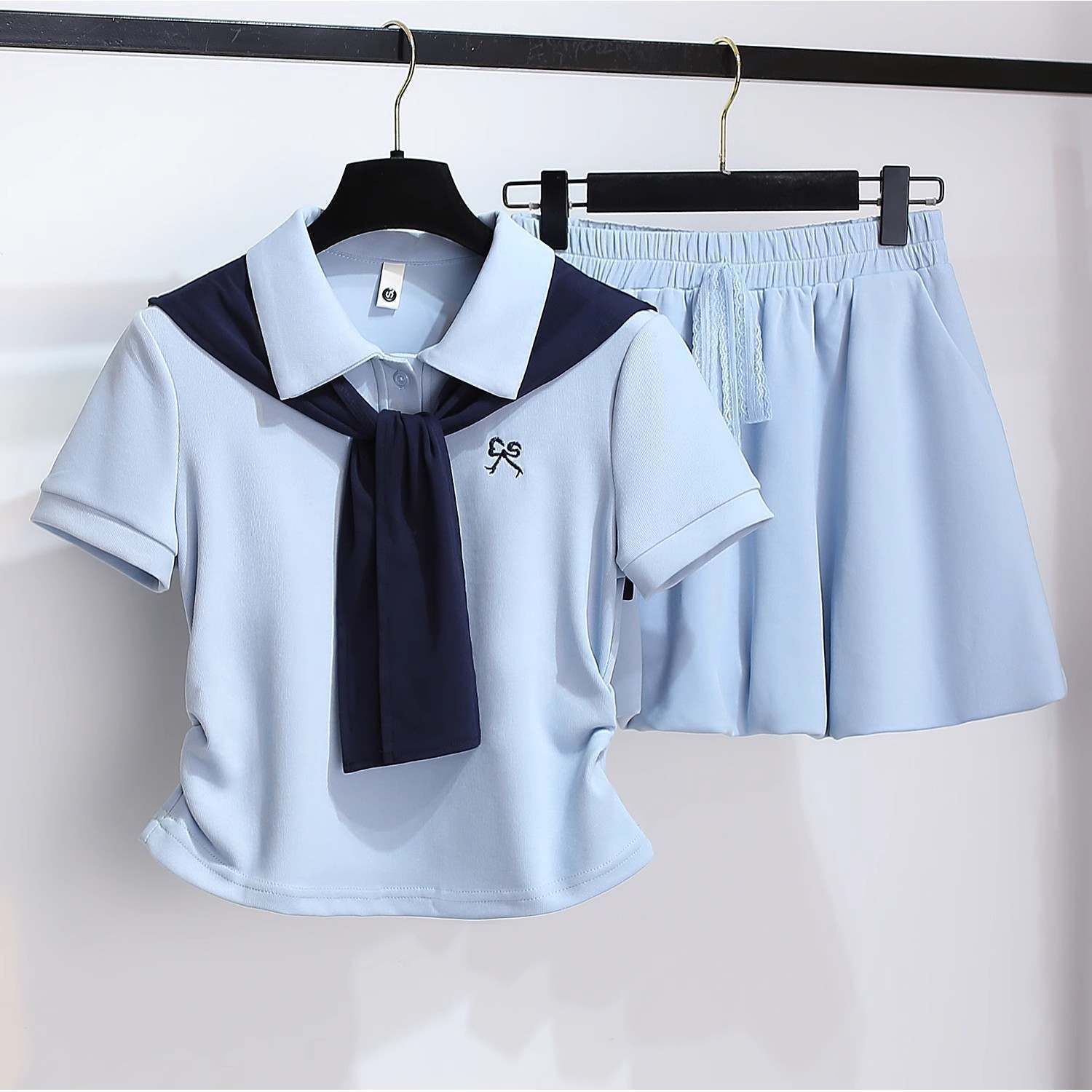 韓国版クロスボーダーサマーカジュアルファッションポロシャツショール半袖Tシャツショートスカートスポーツスーツレディース3点セット