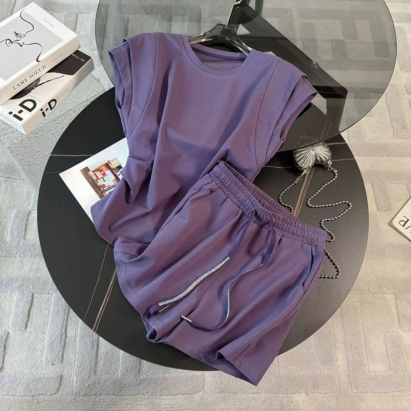気質ニッチファッションカジュアルスーツ女性の夏の新しい無地ラウンドネック半袖トップ巾着ショーツ 2 点セット