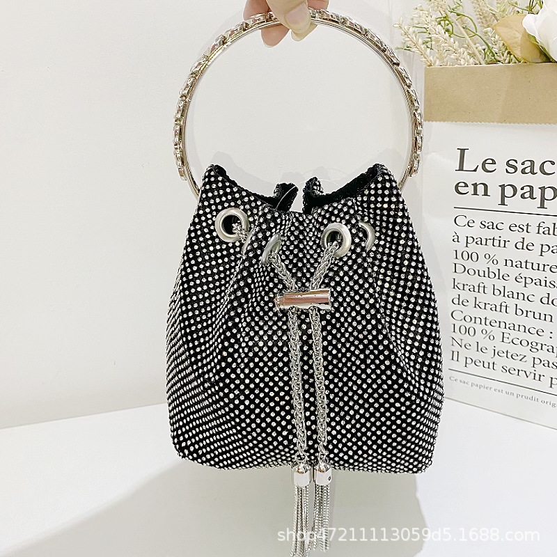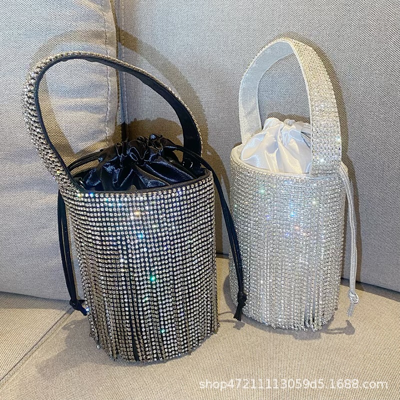 フリンジが輝いていて、バケツにシルクのドリルを包んで、バケツの宴会のダイヤモンドの手で斜めのショルダーバッグの女性を持っています。