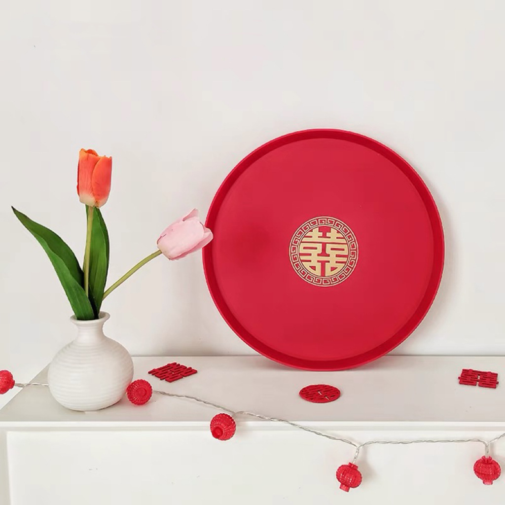 結婚式の喜びの皿の結婚式の皿の円形の喜字の赤い皿の新婦の敬茶のキャンディーの皿のプラスチックの中国式のドライフルーツの皿