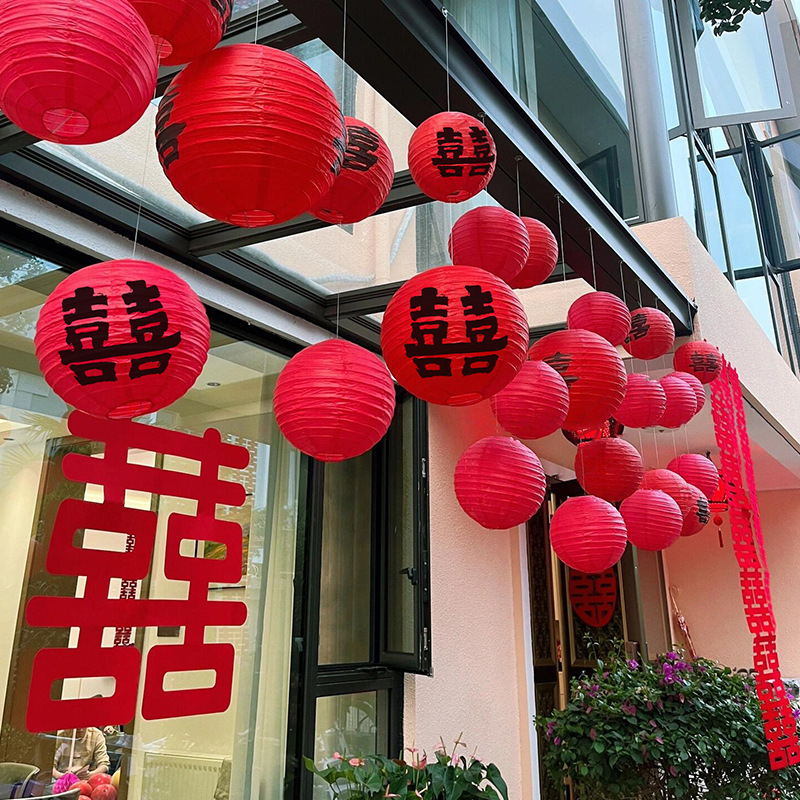農村の庭の子供の玄関は結婚の喜字の紙の提灯の結婚の部屋を飾ってセットの赤いハニカムのボールの室外を飾ります。