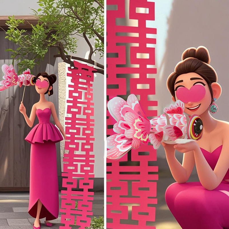 結婚して結婚する部屋の立体の喜字の配置の装飾の積み重ねの頭の置物の寝室の客間の結婚式の写真撮影のスーツの着地の置物