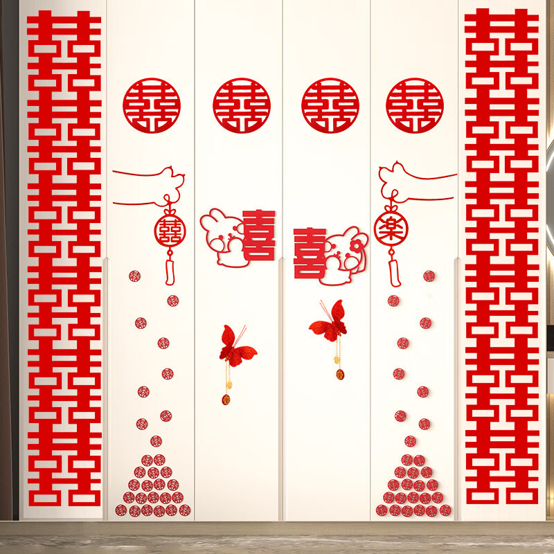 結婚専用の喜字は結婚式の結婚部屋の装飾を貼ってセットを配置します。
