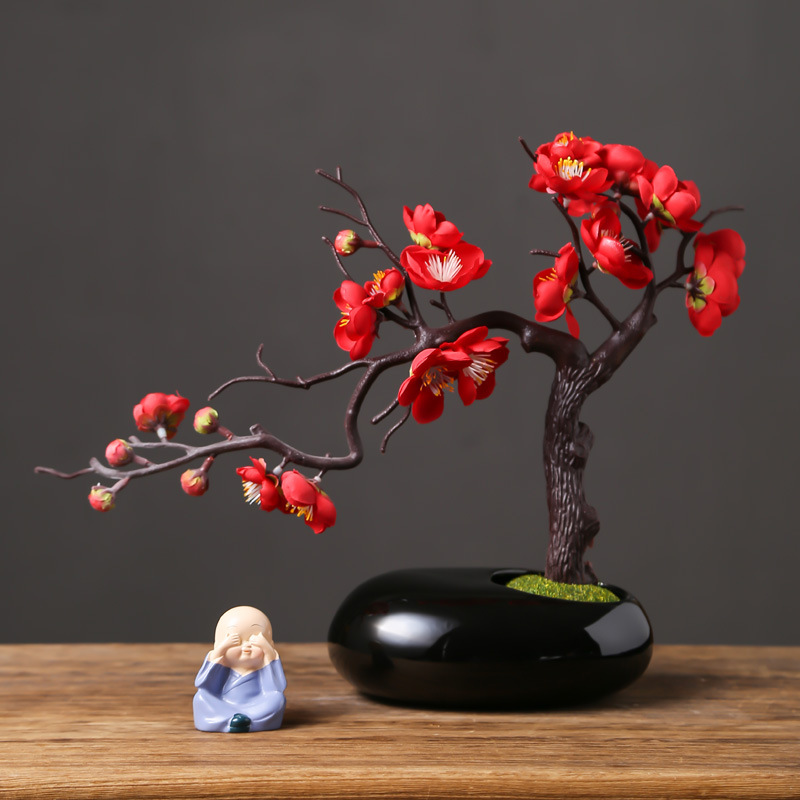 現物は梅の花の花の枝の陶磁器の花瓶の置物の客間の乾いた花を飾って客間の室内の装飾の花を飾って挿します。