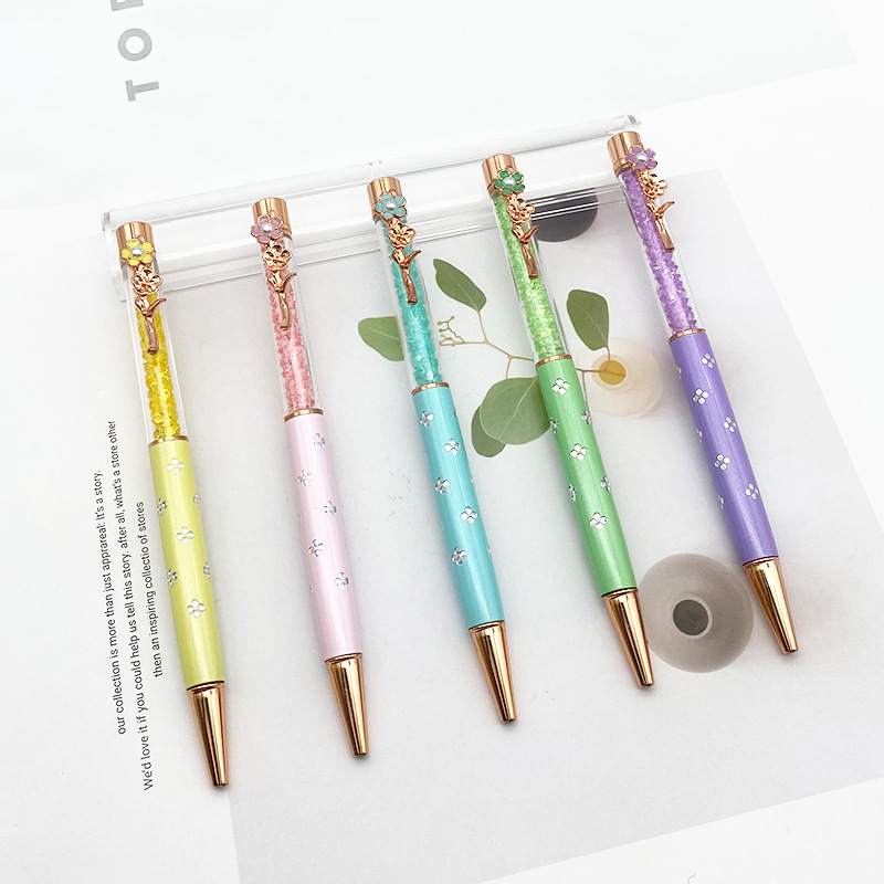 かわいい真珠花ペンクリップ水晶ペン回転式トップドリル金属ボールペン広告ギフトペン彫刻ロゴ