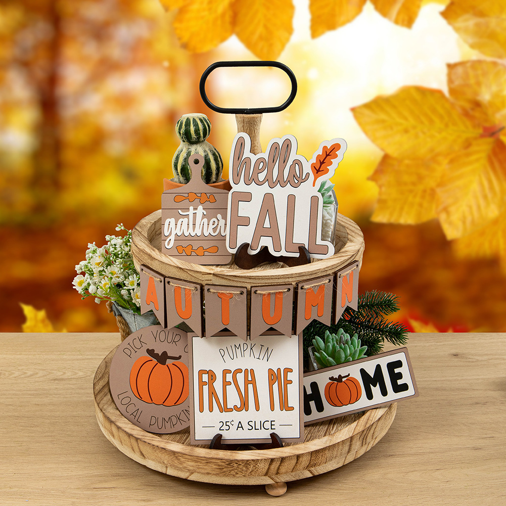 感謝祭のレイヤードトレイデコレーションセットハローフォールホームサインカボチャ木製装飾オーナメント