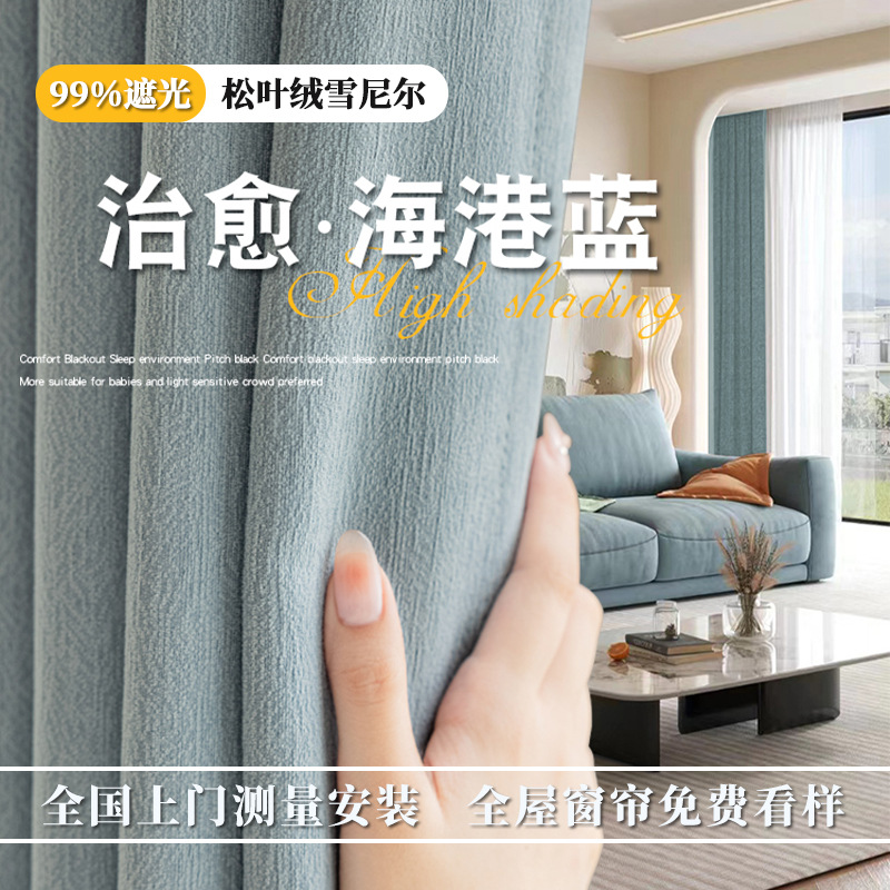 母子級はシェニールカーテンを厚くして、全遮光松葉パイル寝室の高級感がある青い客間は贅沢で定型的である