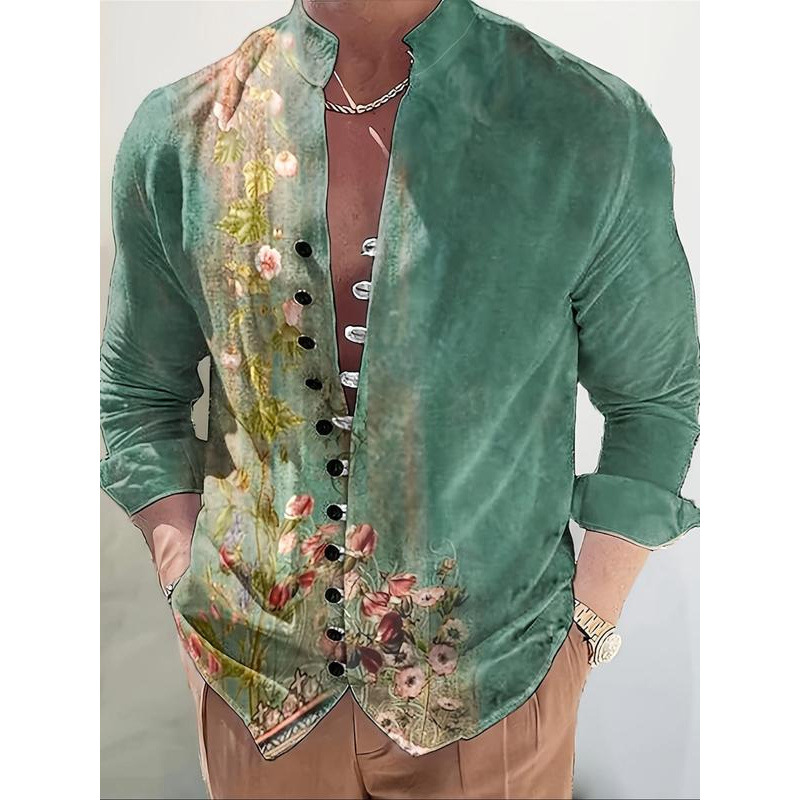 跨境Men's Floral Print Button Front Shirt Regular Fit Casual