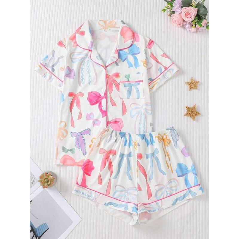 クロスボーダー レディース オールオーバー ボウ プリント ボタン フロント シャツ & ショーツ