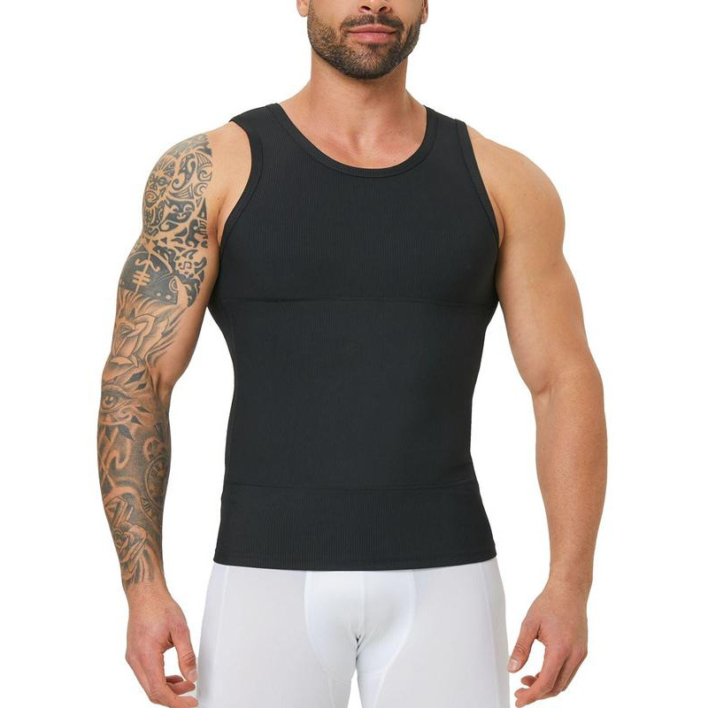 跨境Men's Solid Ribbed Compression Top High Stretch Tummy