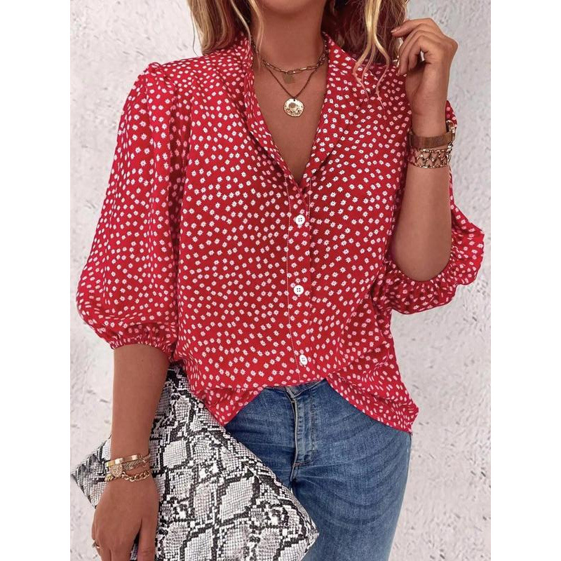 レディース花柄シャツカジュアルビショップスリーブ襟付きトップ