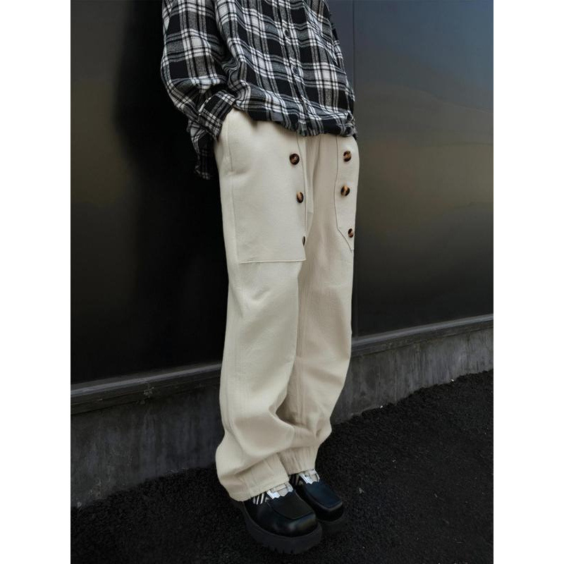 メンズ ソリッド ボタン ポケット ドローストリング ウエスト パンツ レギュラー フィット