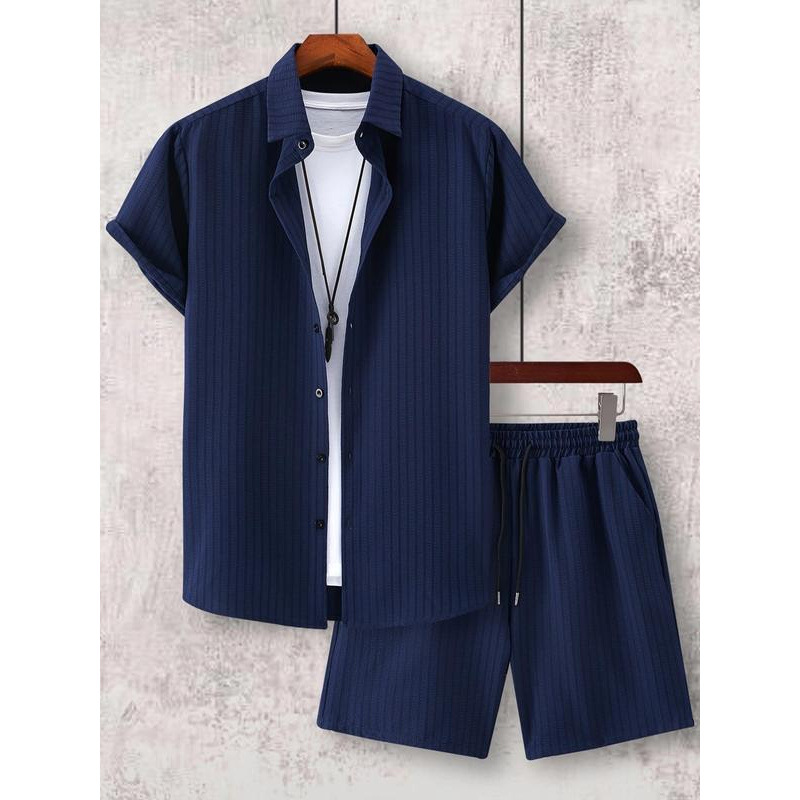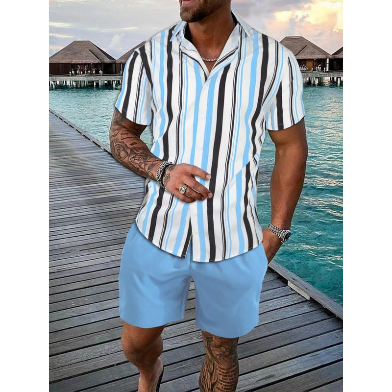 ツーピースセット メンズ 夏服 ストライプ ボタンダウンシャツ